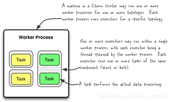 一个运行的Topology就是由集群中多台物理机上的多个worker进程组成