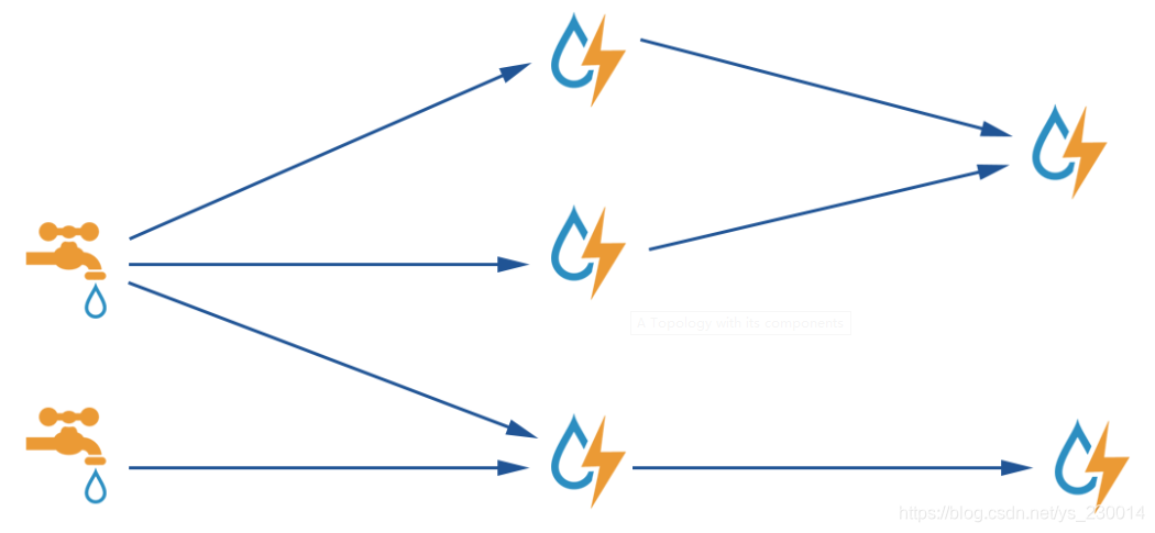 水龙头是Spout,产生水的,水滴就是Tuple,水滴会传递到Bolt,用来处理数据,这里会有很多个Bolt,Bolt又会传递到下一个Bolt,这个Bolt之间的传递就是Stream,数据流,而整个流程就是拓扑Topology